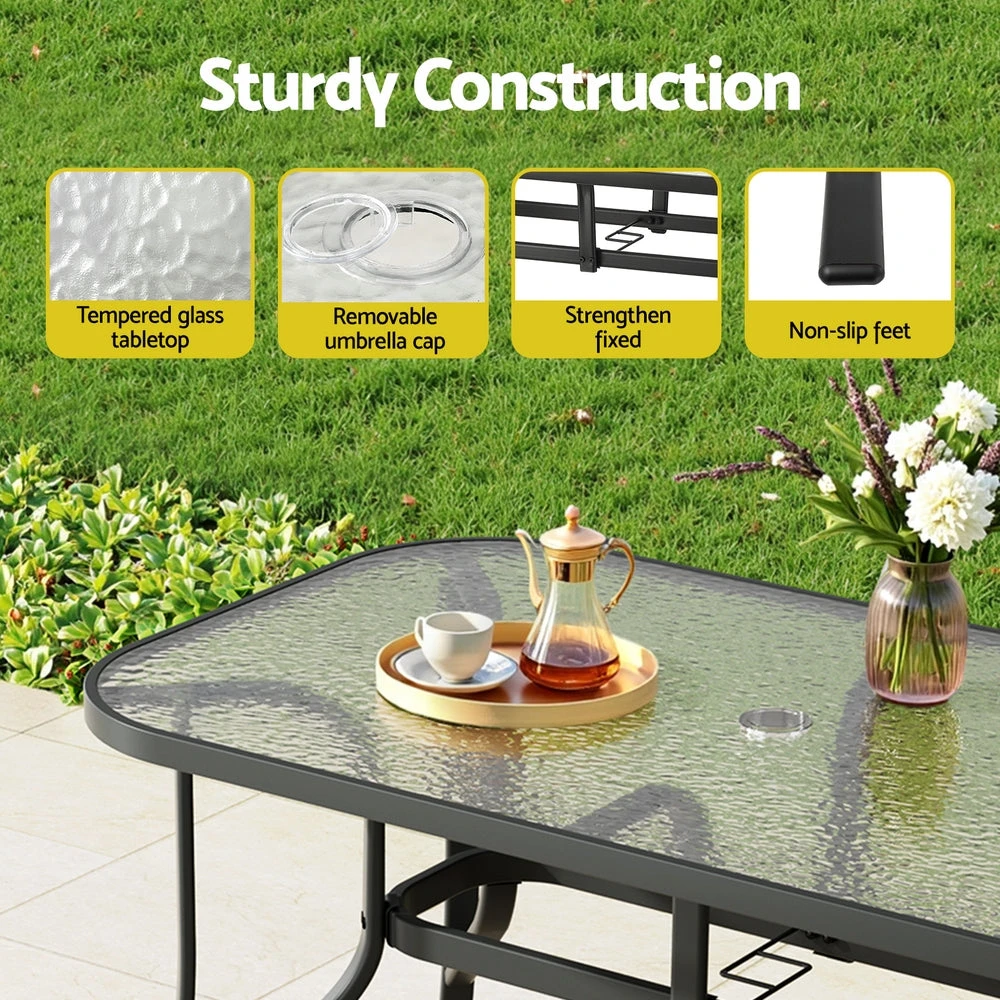 Designed for Aussie backyards, balconies, and patios, this 120cm outdoor dining table offers everything you need for sunny lunches and relaxed evenings outside. Featuring a sleek black powder-coated steel frame and a shatterproof tempered glass top, it’s built to handle the elements and look good doing it.