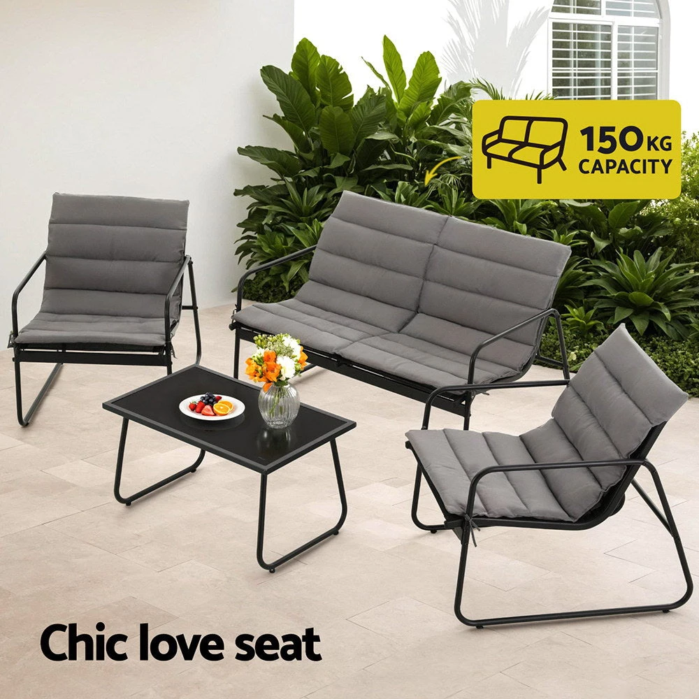The set includes two single chairs, a spacious two-seater bench, and a sleek coffee table topped with shatter-resistant tempered glass. Whether you’re sipping your morning coffee or entertaining guests in the evening sun, this lounge set delivers style, comfort, and practicality in one easy-to-assemble package.