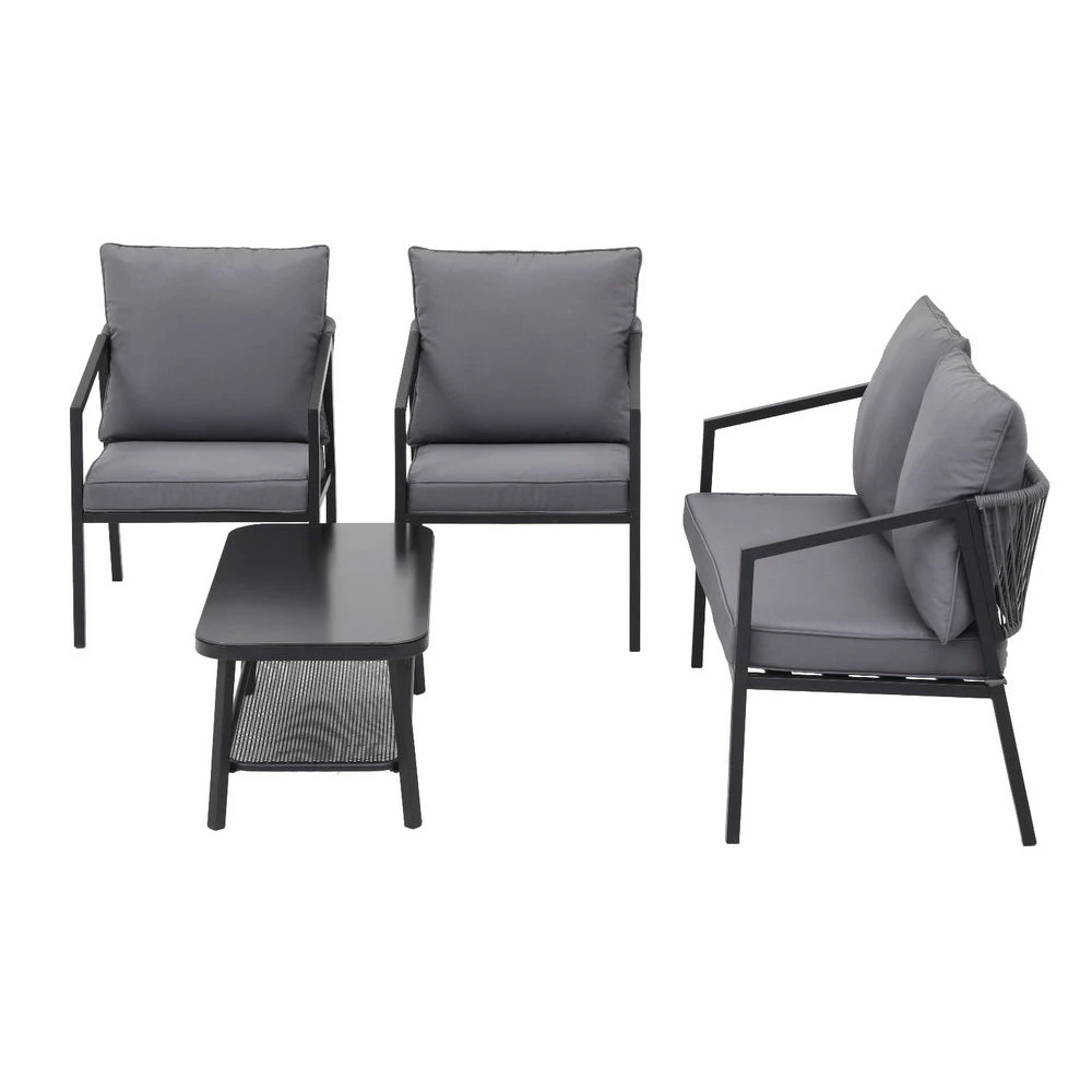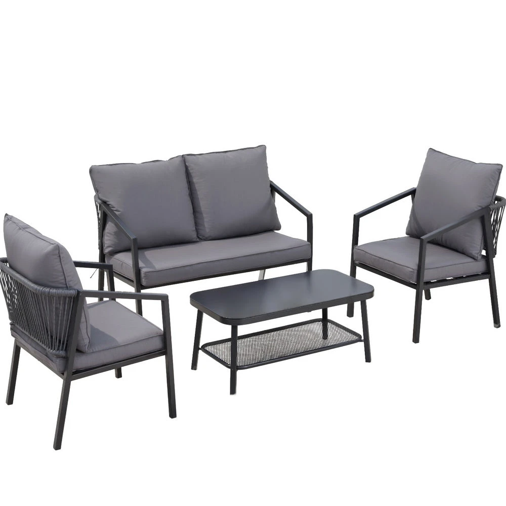 Transform your outdoor space with the elegant 4-Piece Outdoor Sofa Set, designed to seat four people comfortably. This versatile set includes two single sofas, a 2-seater sofa, and a matching table with a 5mm tempered glass top.