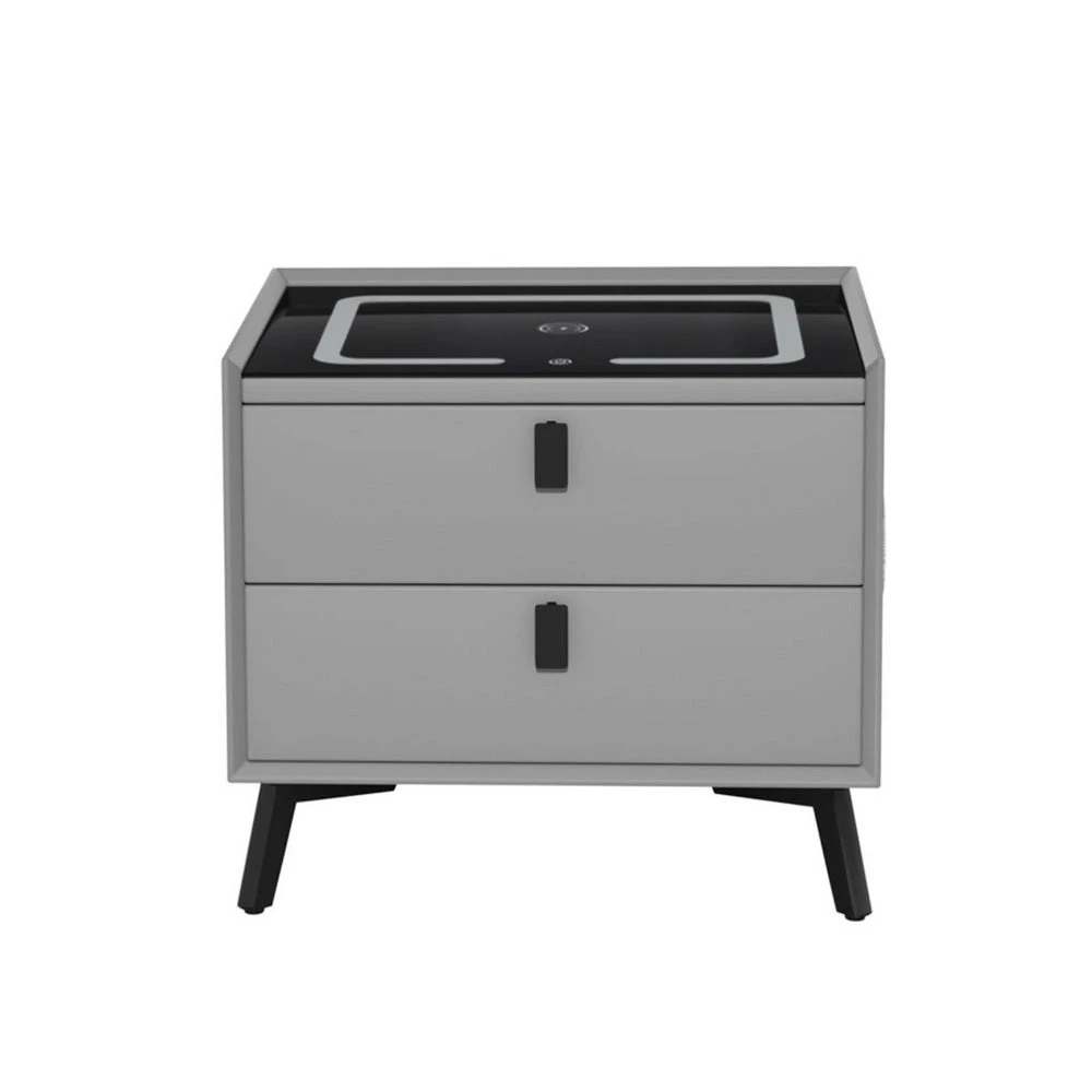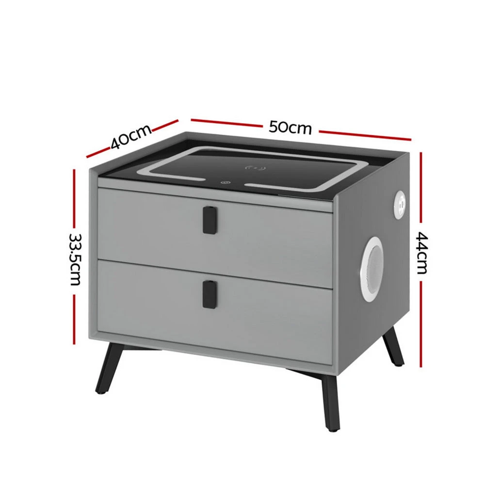 Upgrade your bedroom with the stylish Aika Grey Smart Bedside Table, designed to offer both modern technology and sleek aesthetics. This smart bedside table features wireless charging for Qi-compatible devices, Bluetooth speakers for seamless music streaming, and USB and Type-C charging ports for versatile device charging.