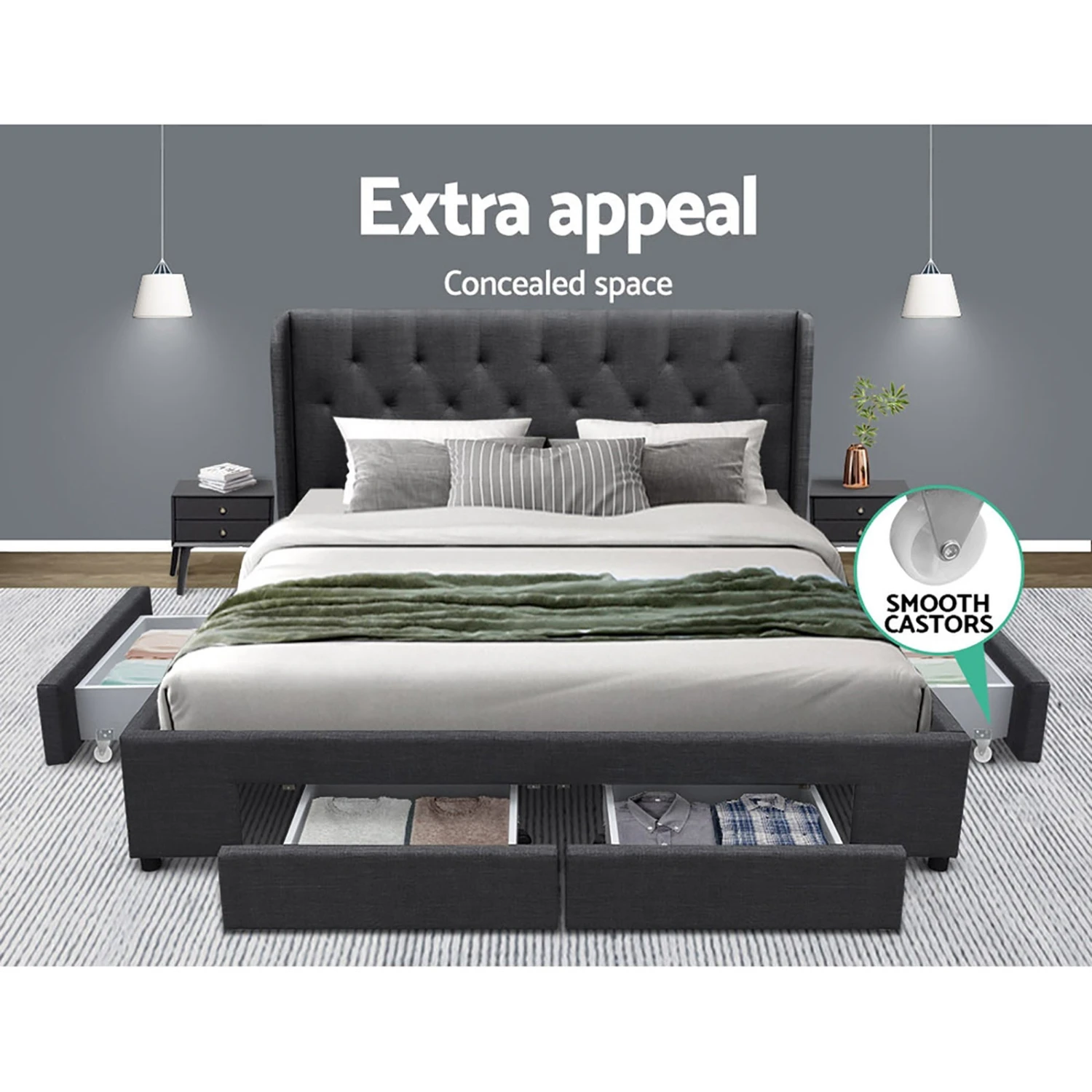To top it off, there are four spacious drawers to store your clothes, linen or a host of other personal essentials. Style and storage, it is time to upgrade to the Avalon bed frame today!