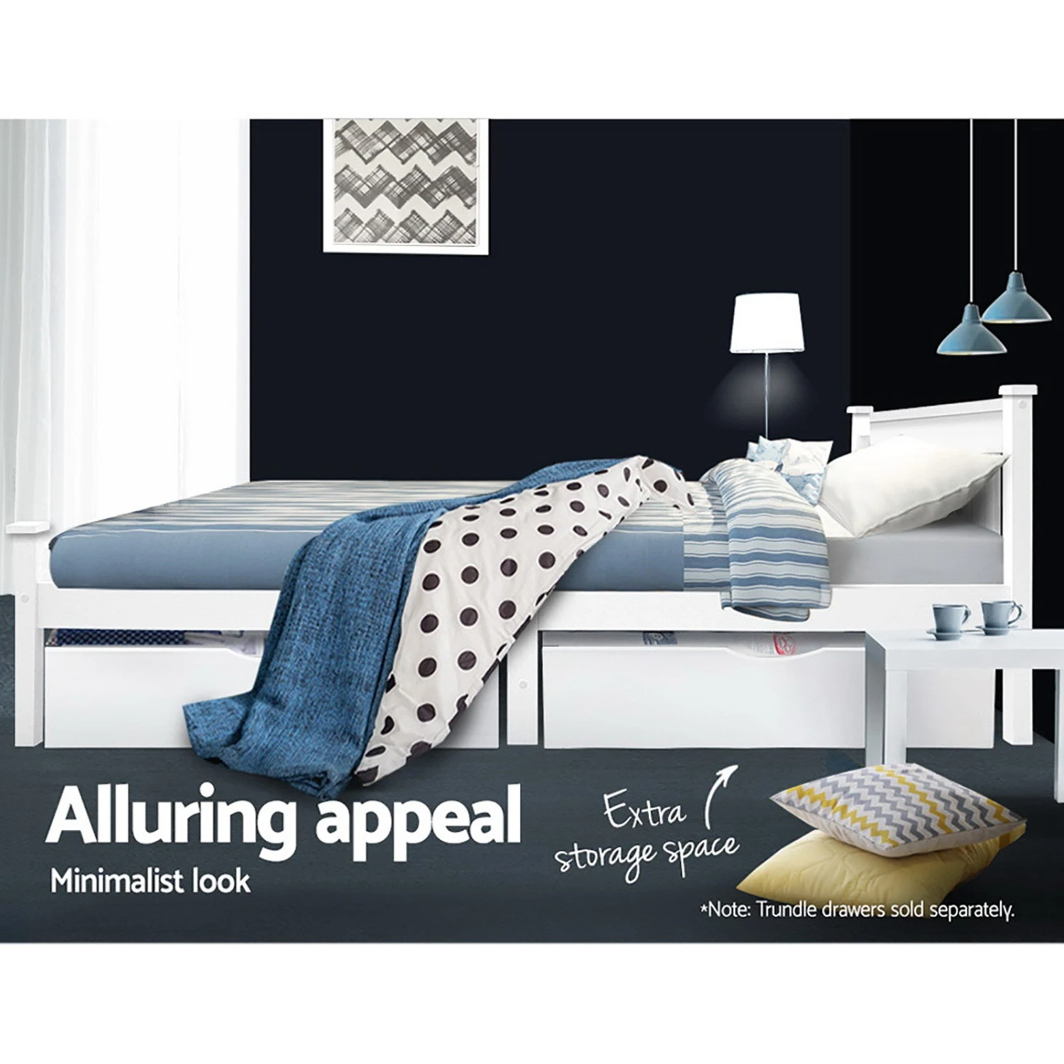 Finished in a non-toxic, eco-friendly white paint, the neutral-coloured Bed Frame makes for easy décor coordination with any bedroom. Better still, the Bed Frame also has ample space below to fit in a pair of optional trundle drawers for extra storage of bedding essentials.