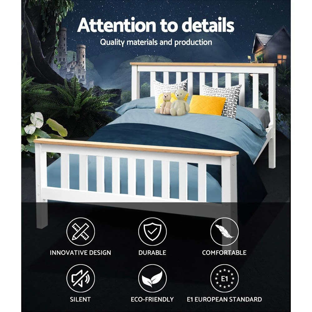 Constructed of solid pine wood, the bed frame features quality plywood slats smooth finished edges, heavy-duty steel fixings and reinforced bracket support across the frame that cheaper alternatives do not provide.