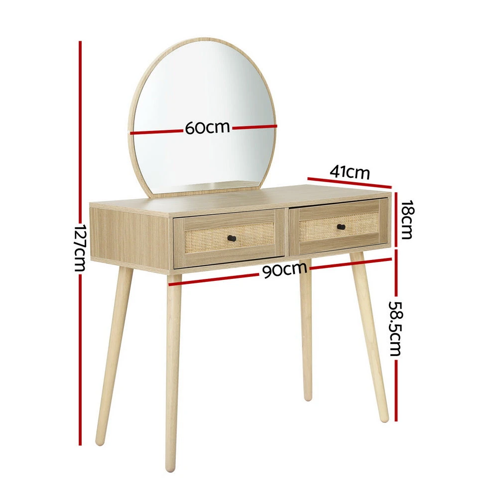 Complete your morning routine with the Frances Dressing Table. Made from 15mm thick particle board with a smooth melamine finish, real rattan drawers and solid rubberwood legs, the dressing table is designed to last through many early mornings and late evenings. With two generous storage drawers, you can fit all of your make-up, accessories and other health and beauty essentials. The anti-rust drawer runners ensure smooth opening every time. Splayed rubberwood legs keep the table stable and contribute to the generous 60kg weight capacity. The round mirror allows you to get up close and personal for skincare and makeup application and a full view of your ensemble when you’re done. With the Frances Dressing Table, you’ll always be ready for what the day brings.