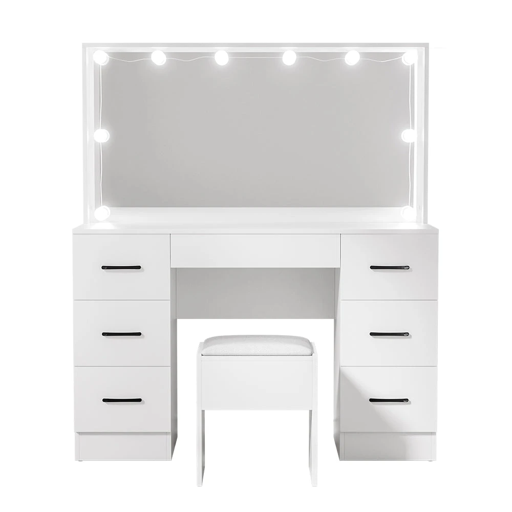 Feel like a star straight out of Hollywood with the Debbie Dressing Table. Packed with generous storage and other convenient features, your new beauty routine will be a breeze. Made from quality MDF particleboard with a melamine finish, the table is built to last. The Hollywood-style makeup mirror is surrounded by bright LED bulbs for the perfect illumination. Choose from warm, neutral and daylight white light so you can always look stage-ready. Seven generous storage drawers with sleek handles open smoothly on anti-rust runners, giving you instant access to your beauty essentials. A foam-padded PU leather stool allows you to sit comfortably while applying make-up or skincare and can be neatly tucked away when not in use. Easy to install and even easier to maintain, you’ll love getting ready for the day in front of your new Debbie Dressing Table.