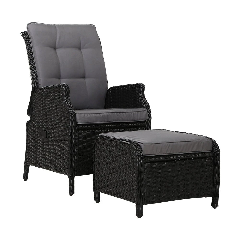 Now you can really sit back and chill in the outdoors with the Ella Wicker Recliner Set.