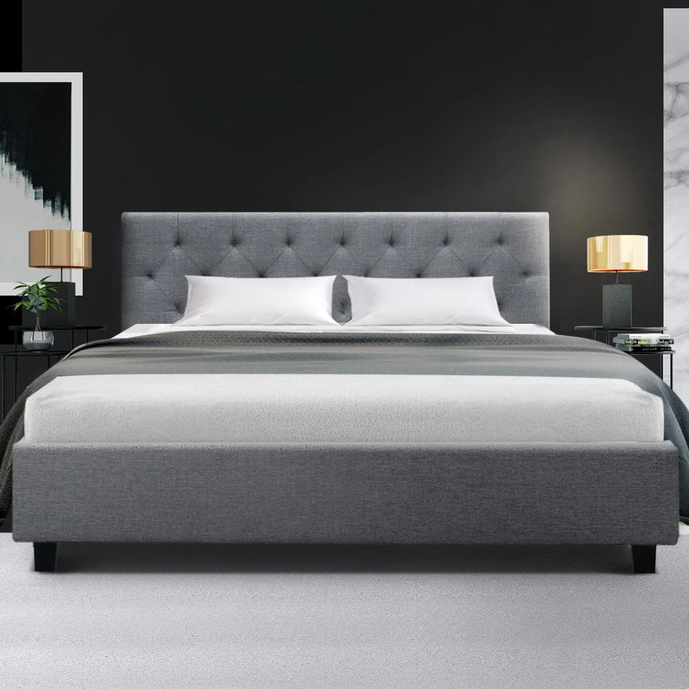 The bed frame features a wooden arched slatted base that helps to distribute body weight evenly across the frame. Of particular interest too is the tufted bedhead that really gives the bed frame a designer-class status.
