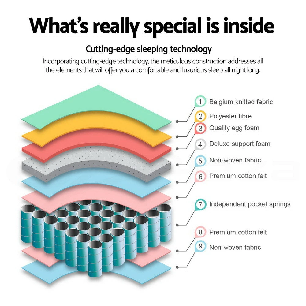 Covered with premium Belgium knitted fabric for unsurpassed softness and body heat dissipation, the Giselle Bedding Firm Mattress is also highly breathable and dust mite and mould-resistant with no necessity to turn over the mattress, unlike other inferior alternatives. Handy side handles enable you to position the mattress easily.