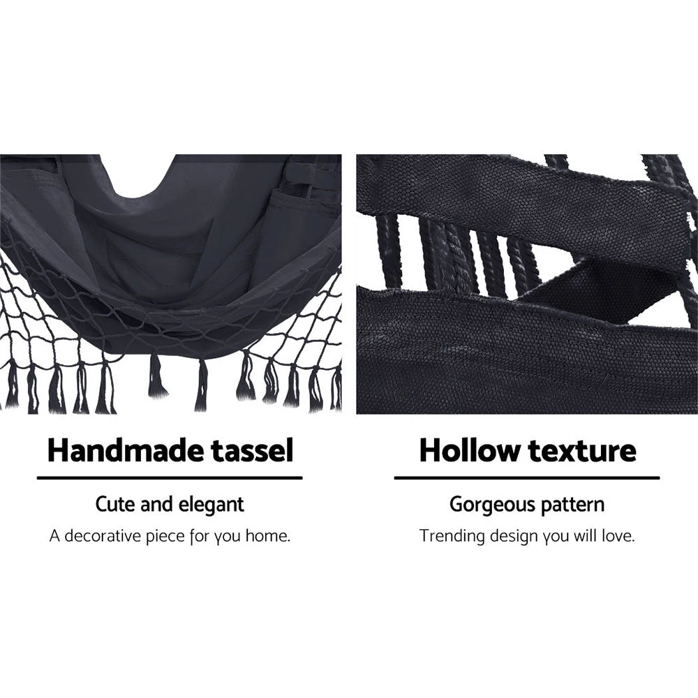 Our hanging hammock chair set is a piece of excellent furniture perfect for outdoor and indoor use. It is made from quality polyester cotton blend fabric and has a solid timber rail for strength and durability, and the powder-coated steel frame is designed to be weather and rust-resistant. Our wide base hammock chair can hold up to 120kg in weight and offers stability. Plus, it’s easy to install with one single attachment point for absolute safety. This versatile furniture set is suitable to be placed by the poolside, in the backyard, or in any corner of your home. Not least, this chair offers ample support to your body.