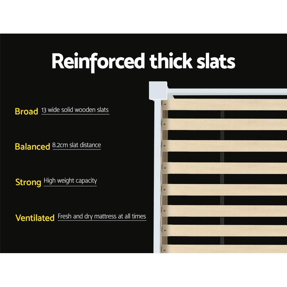 Strong and sturdy, the bed frame comes with a solid timber slated base, stylish headboard, heavy duty steel fixings and smooth edges all round.