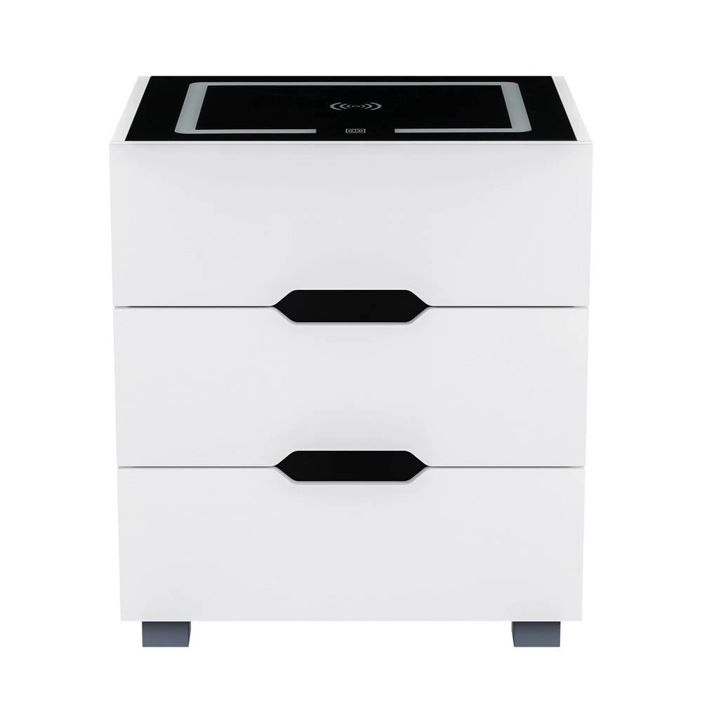 Elevate your bedroom décor with the sleek and functional Smart LED Bedside Table. Designed to enhance your living space, this table offers convenient wireless phone charging alongside USB compatibility. Crafted from premium particleboard and adorned with a tempered glass tabletop, it blends style with durability seamlessly.