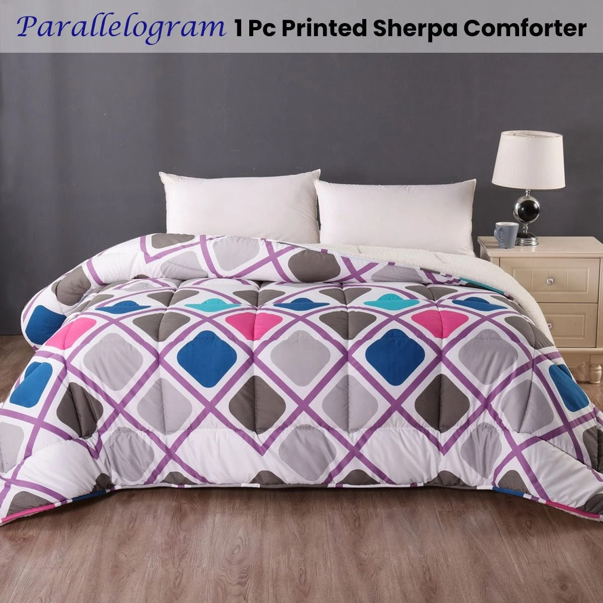 The Square 1 Pc Printed Sherpa Comforter by Ramesses is a luxurious addition to any bedroom, promising not only style but ultimate comfort. Adorned with a contemporary geometric pattern featuring vibrant hues of white, grey, blue, pink, purple, and charcoal, this comforter is as visually appealing as it is cozy. Made from quality and soft touch materials for an extra layer of warmth. This piece ensures that your nights are as stylish as they are snug.